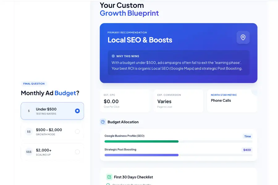 Answer a few questions and get guidance on where your ad budget should go. Helps avoid wasted spend and focus on platforms that fit your business type.